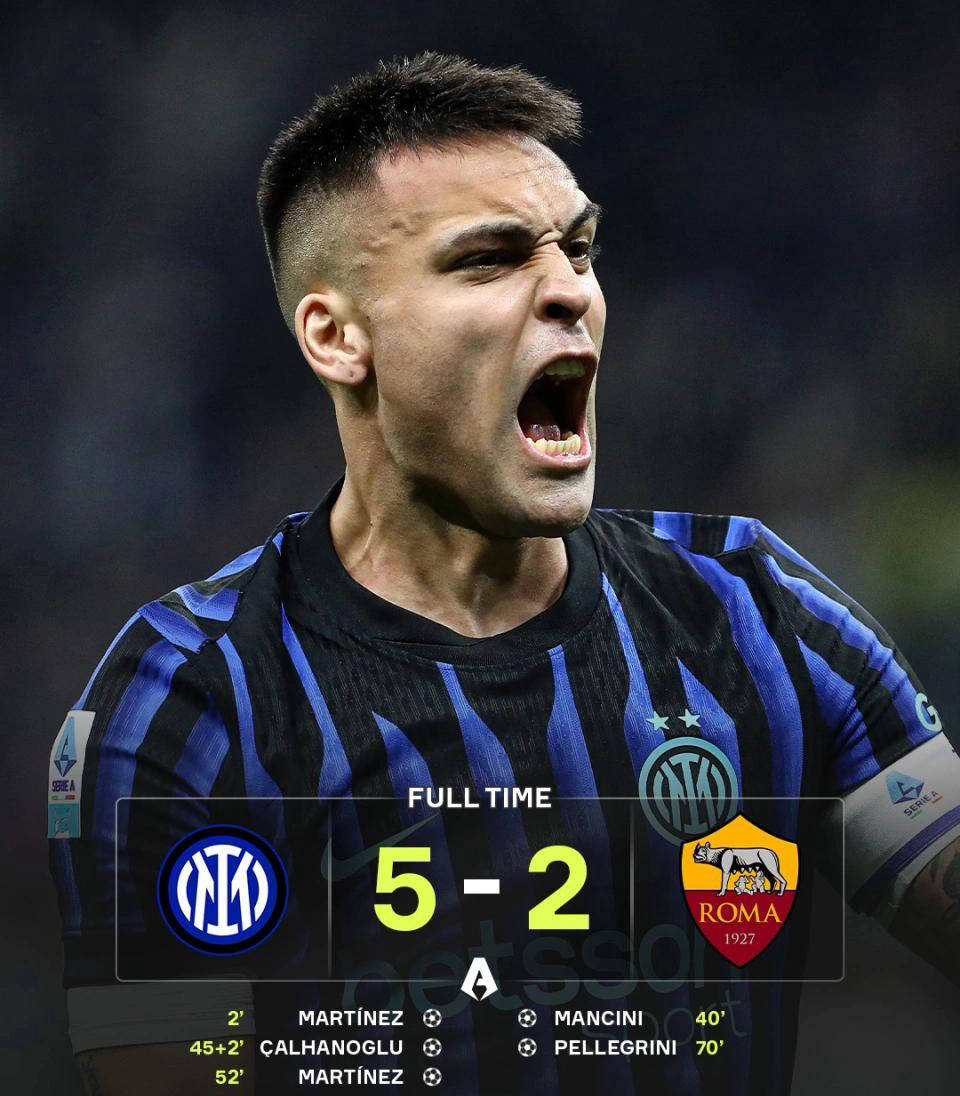 下半场重新开始后,国米进入了全面表演模式,第53分钟,图拉姆助攻劳塔罗,再次扩大比分至3-1。仅仅三分钟后,图拉姆又在角球中利用头球破门,将比分改写为4-1。第63分钟,巴雷拉的轻松推射让国米将领先优势推至5-1,让比赛彻底失去悬念。尽管佩莱格里尼在第71分钟为罗马打入一球,但最终比分定格在5-2。此役结束后,国米在先赛一场的情况下,以9分的优势领跑AC米兰,将竞争压力甩给了对手。同时,劳塔罗的梅开二度使他的进球总数达到173,超越博宁塞尼亚,独自占据球队历史射手榜第三位,仅有梅阿查和阿尔托贝利在他之前。