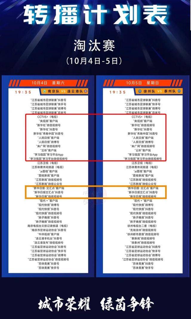此外,据江苏省城市足球联赛官方公众号信息显示,本周六、周日的淘汰赛转播平台多达41家!除CCTV5+外,央视频客户端、新华社、人民日报、央广网以及众多国家级、省级主流平台都将全程转播!堪称万众瞩目!