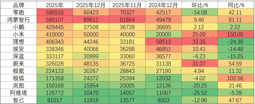 蔚来在2025年交付了32.6万辆,成为了交付最多的年份,从年初的存亡危机中算是彻底地脱离出,特别是12月交付48135辆,更创下新的交付纪录,甚至在月度排名中超过了小鹏和理想,蔚来、乐道和萤火虫都实现了增长,算是证明产品策略的成功。