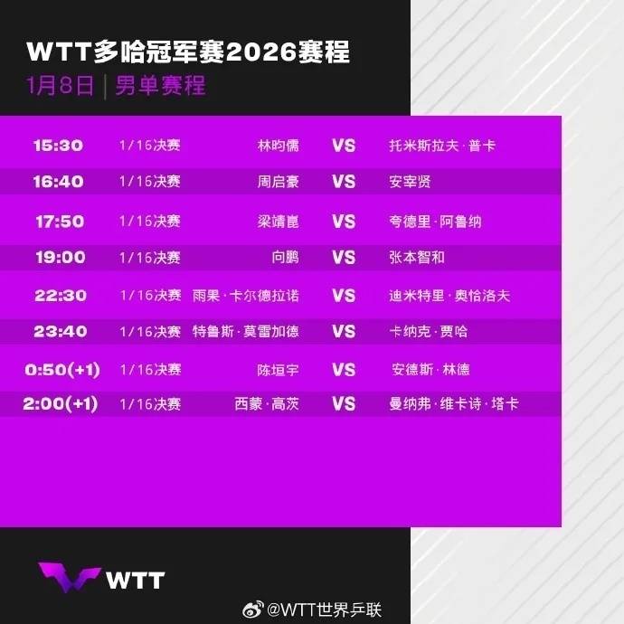2026-01-08足球直播,欧洲杯直播,体育直播,球客直播,雷速体育,篮球直播,风驰直播,NBA直播,英超直播,足球比分,足球赛事,意甲,欧冠,世界杯,世界杯直播,村超,贵州村超,波胆,角球,串球,大小球北京时间1月8日消息,2026年WTT多哈冠军赛继续进行,CCTV5、CCTV5+直播比赛实况。男子单打1/16决赛第二个比赛日,共有梁靖崑、向鹏、周启豪、陈垣宇四名选手出战。其中,向鹏与日本选手张本智和的比赛是最大焦点(