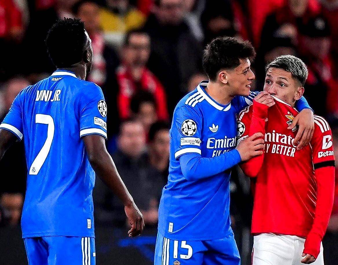 这场引发争议的欧冠比赛,是本菲卡对阵皇家马德里。赛前,维尼修斯的一次庆祝动作,直接点燃了本菲卡球迷和球员的怒火。现场骚乱,杂物飞溅,双方球员一度发生冲突。在本菲卡球员普雷斯蒂安尼捂嘴对维尼修斯说了些什么后,后者随即向裁判投诉,称自己被辱骂为“猴子”。裁判闻讯,立刻举手示意比赛暂停。如此混乱的场面,足以让人感受到欧洲足坛深埋的“潜规则”早已积弊丛生。维尼修斯一度选择拒绝比赛,直接坐回替补席,皇家马德里的队友们纷纷上前劝说,现场气氛紧张至极,堪比全球股市暴跌。